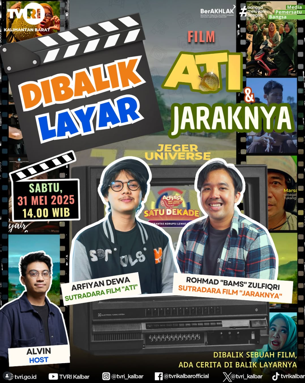 Pontianak, 31 Mei 2025 — Dua sutradara muda berbakat asal Kalimantan Barat, Arfiyan Dewa dan Rohmad “Bams” Zulfiqri, hadir sebagai narasumber dalam program spesial DIBALIK LAYAR yang ditayangkan oleh TVRI Kalbar. Acara ini mengupas proses kreatif di balik dua film pendek yang mengangkat isu lokal dengan pendekatan emosional dan kultural, yaitu “Ati” karya Arfiyan Dewa dan “Jaraknya” karya Bams Zulfiqri.